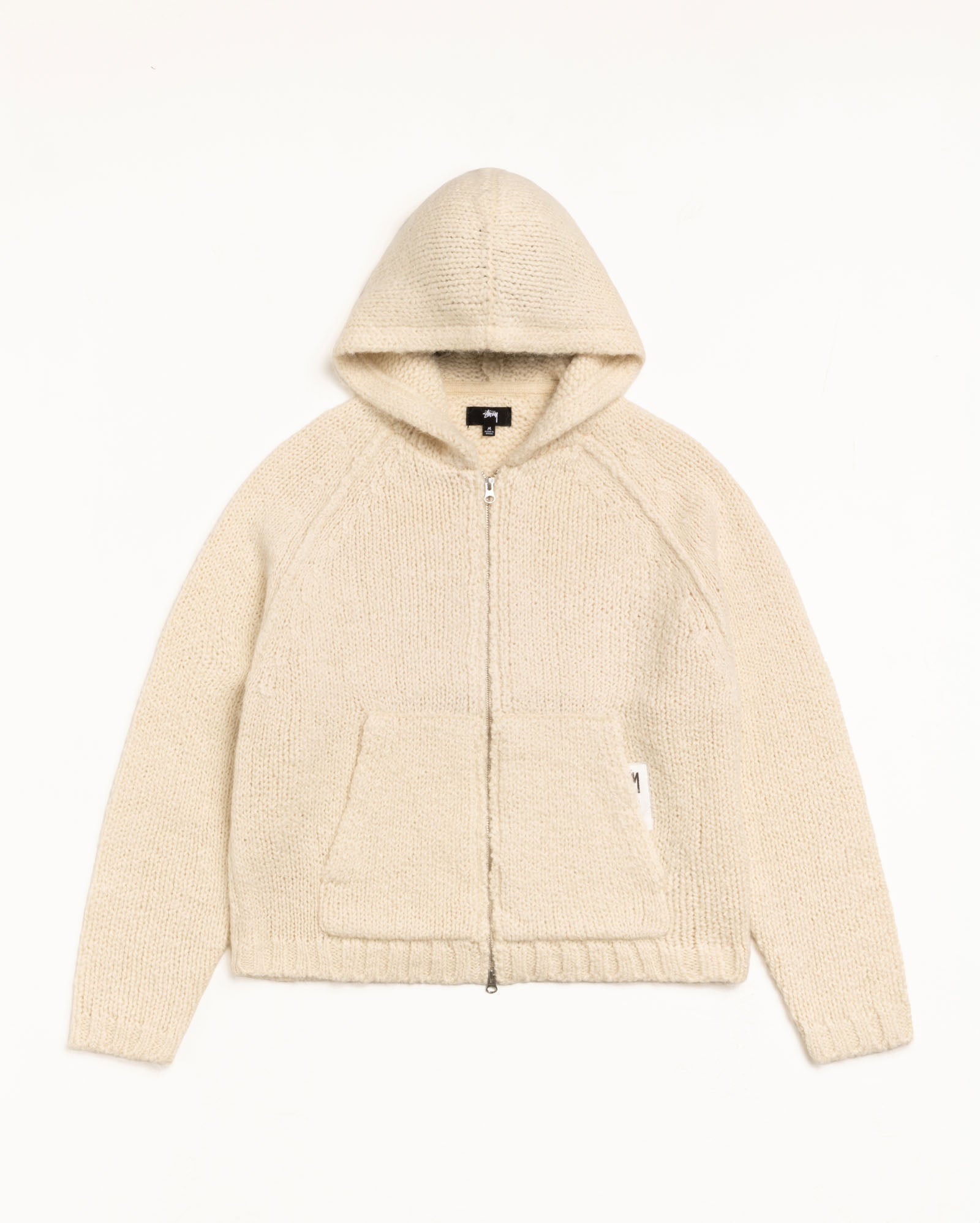 Relaxed hooded sweater with a two-way zip in a chunky alpaca wool knit. Stüssy label inside the left pocket.
